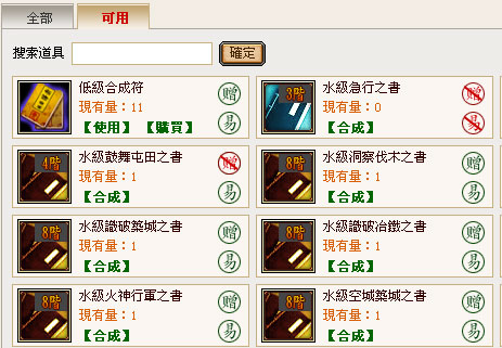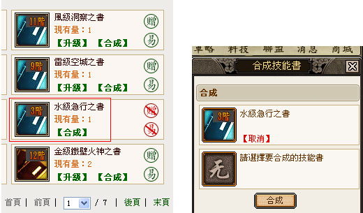 此時,技能書合成介面左側會顯示出此技能書合成時,所有可用的合成道具,包括可以當做另一本祭書的技能書,和可以替代另一本祭書的合成符:
