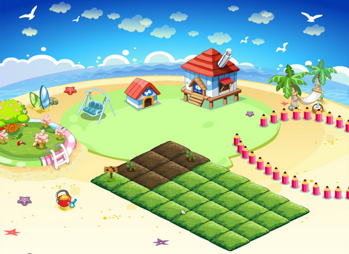 快樂島主》專屬背景與道具:飲料小屋、海島背景、泳圈花園、汪汪狗屋、鉛筆柵欄。