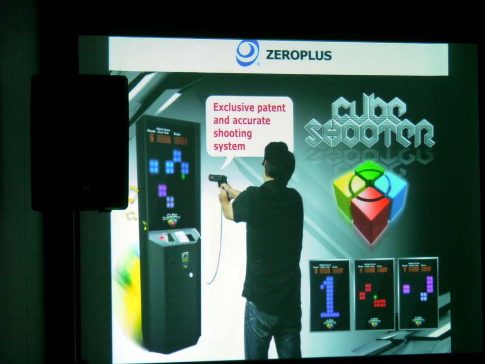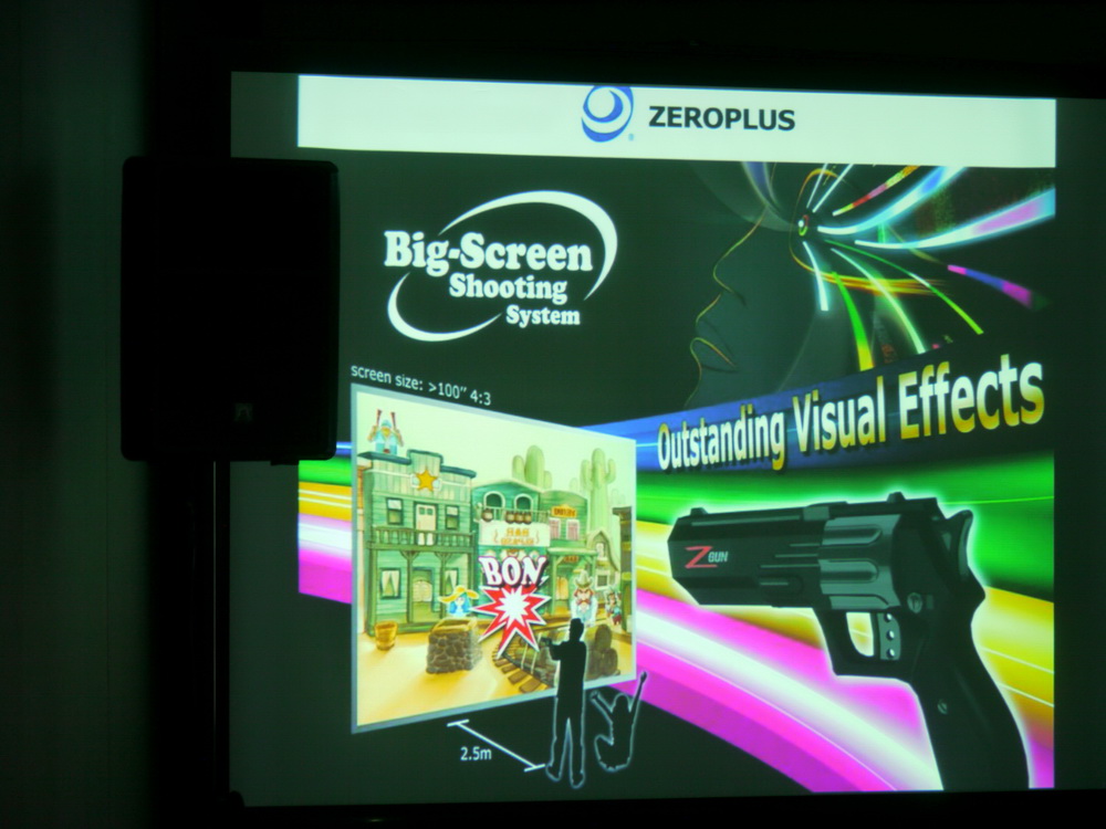 此次孕龍科技展出產品為大螢幕近距離使用射擊系統,讓玩家在遊戲中感受身歷其境的互動式槍戰場景,並展出簡單上手的方塊射擊機台。