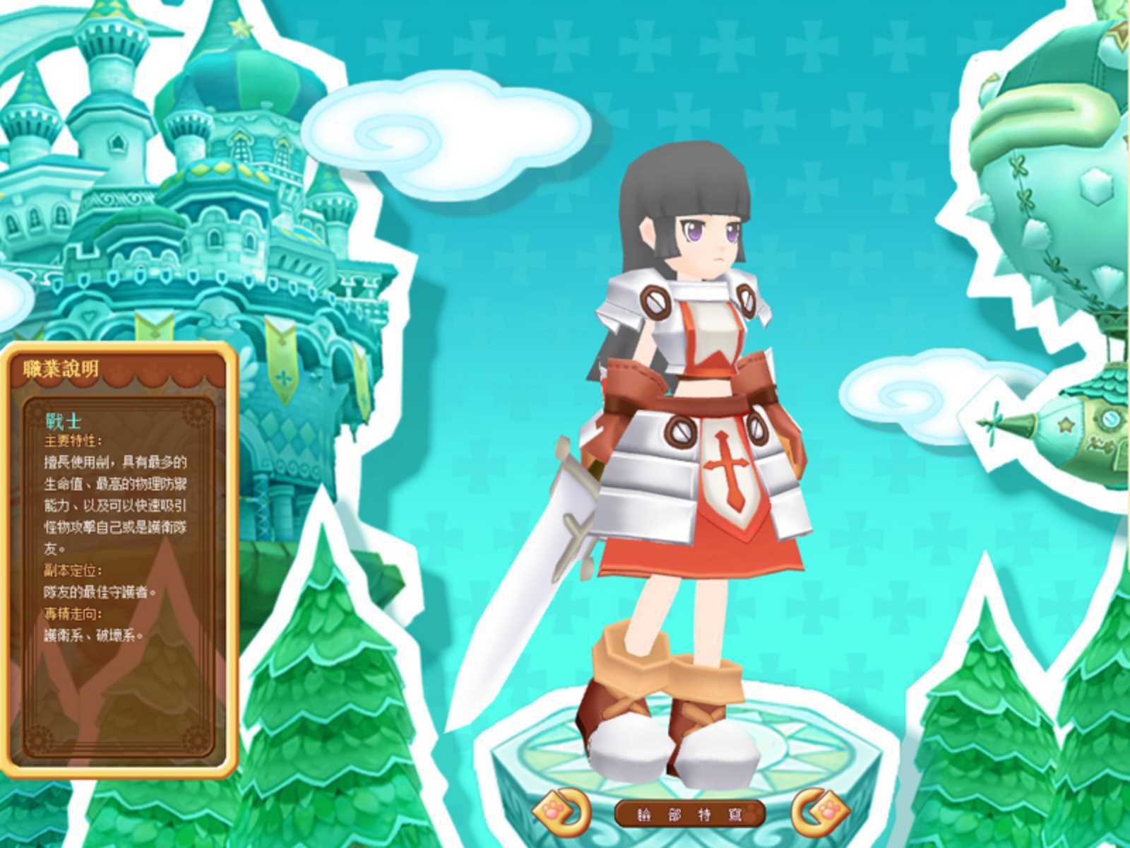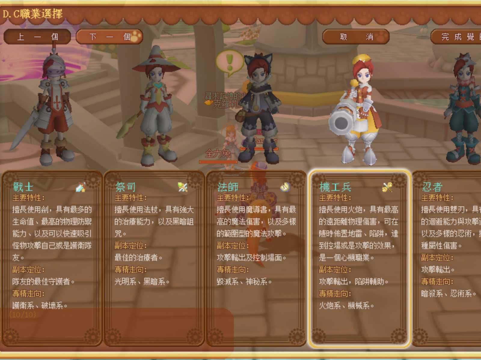 6 個職業的技能各有特色,除了一般玩家認知的坦職劍士、補血祭司、輸出的法師外,忍者、機工兵跟拳師這三種職業是推薦玩家要試試看的特色職業。劍士的技能多為防禦型、以及吸引怪物的火力,在小隊任務時是屬於典型當肉靶的職業;而最新開放的拳師除了攻擊輸出外,小部份上可以替劍士擔當分攤傷害的副坦職。忍者與機工兵是屬於一近一遠的輸出職業,不過除了一般輸出之外,忍者有許多忍術可以運用,機工兵則是可以設置陷阱,都有不錯的輔助技能。
