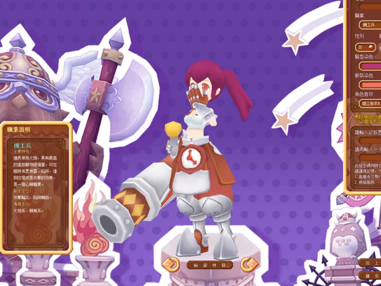 玩家在進入遊戲後,可以選擇目前已經開放的 6 種職業:劍士、祭司、法師、忍者、機工兵以及最新在香港率先推出的拳師。除了一般可自由設定的髮型、臉型等選項外,人物角色的初始裝備配色也是可以設定的,然後右邊會看到可挑選的聲優配音。目前每名聲優都有 AB 兩種模式(依據聲優屬性,有傲嬌 + 無口或是腹黑 + 弱氣等選項),對熱愛日本聲優的玩家來說,這些聲優的聲音魅力與張力是為這些角色注入靈魂的關鍵。四名一線聲優包括了堀江由衣、田中理惠、子安武人以及水島大宙等四人,可說是相當豪華與實力派的陣容。