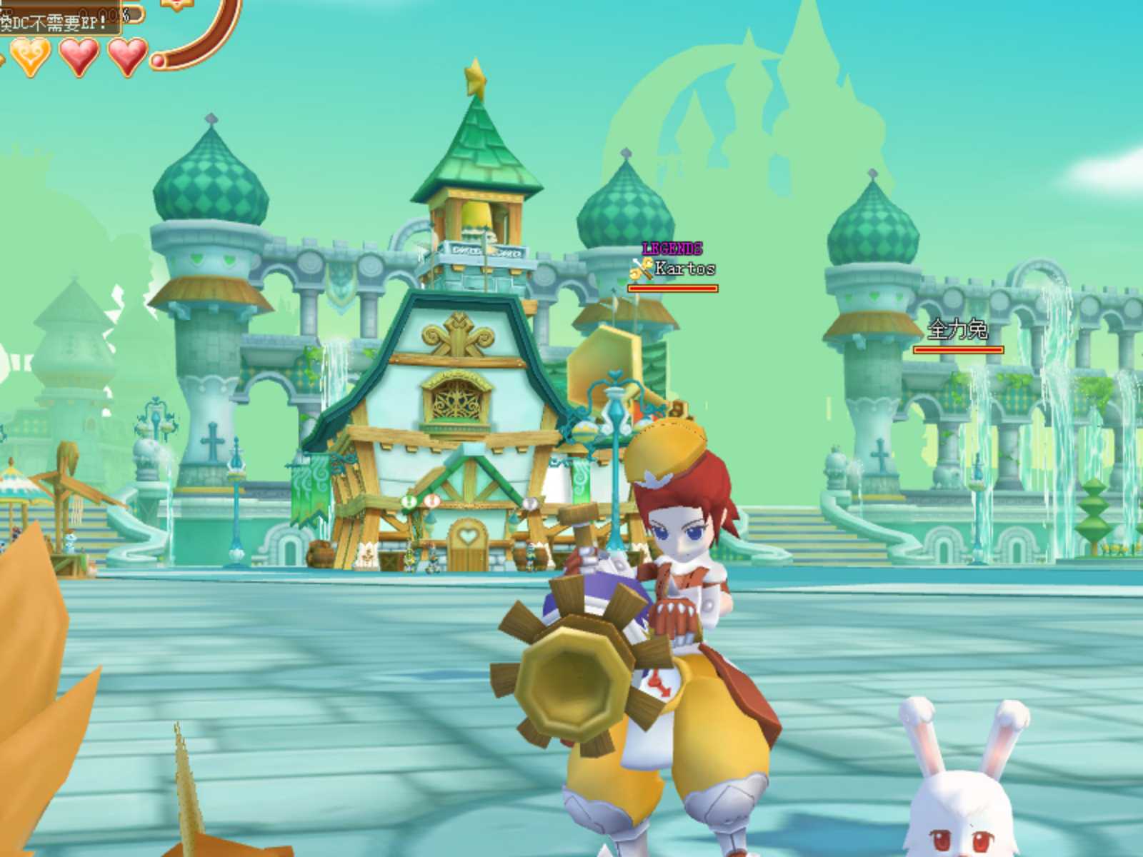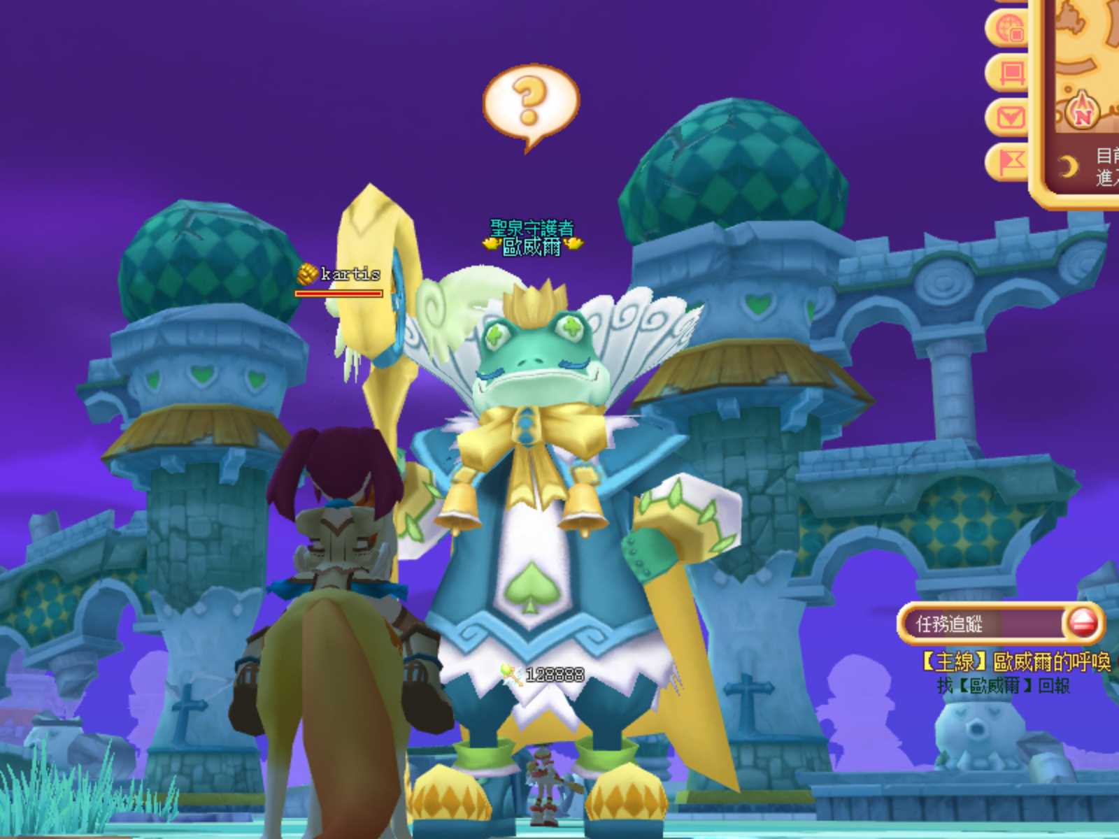 首先跟畫面那隻頭上有驚嘆號任務的大青蛙「守護者歐威爾」對話,玩家會了解到自己是歐威爾的養子,而這個世界剛剛才經過一場大破壞,城鎮「聖泉」也已經殘破不堪,連支撐神、人、魔三界的世界樹都垮了,世界正瀕臨毀滅的倒數。