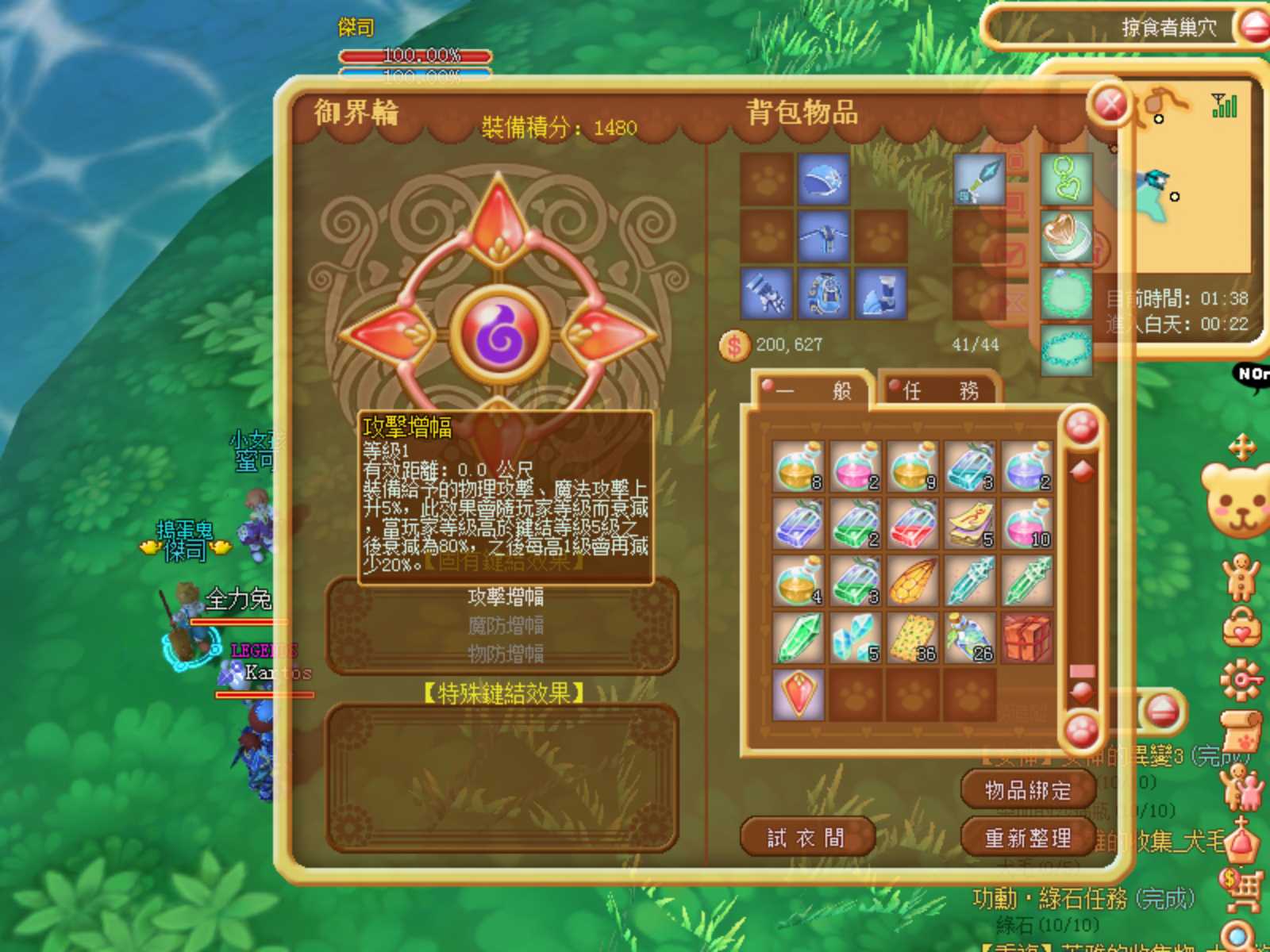 打開寶盒後先拿出基本裝備跟強化用的「御界輪」裝上。御界輪是遊戲中主要的強化方式;基本上一般衣物裝備在沒有裝上寶石的情況下,只有裝飾作用而已。30 級後的御界輪會開始出現「鏈結」:裝備同種的御界輪,就可以產生除了增加屬性之外的特殊強化效果。