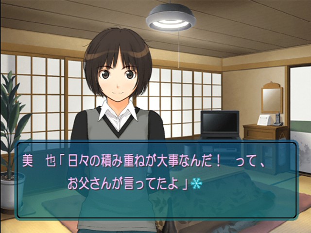 最後,在一天結束時,主角妹妹會替玩家統計和女主角們關係狀況的「美也分析」可以省略,已經對本作攻略很熟練的玩家想要節省時間的話,也可以將美也分析關掉。