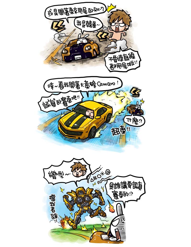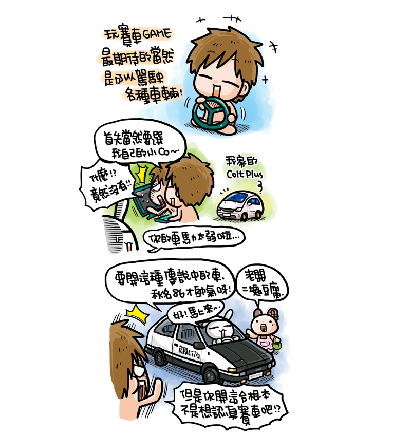 R 進化 ONLINE》甫一推出便深受玩家喜愛,熱愛賽車遊戲的插畫家四小折也來插一腳,將自己賽車心得用 KUSO 插畫表現出來,內容相當逗趣,四小折表示「玩賽車遊戲當然就是要開各種原廠授權車啦!尤其是我喜歡駕駛自己開過的車,這樣玩起來特別有臨場感呢!…R 進化也支援可以播放自己的音樂,當然就是要放《頭文字 D 》的原聲帶才有尬車的感覺啊!其它還有像《