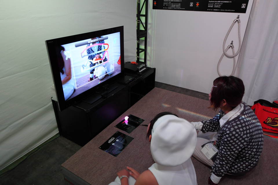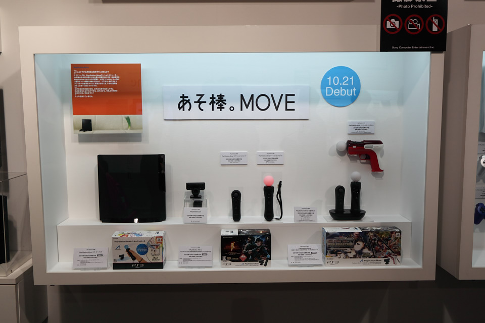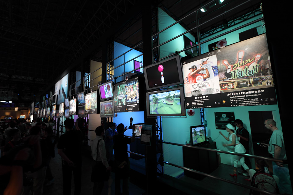 這次 SCEJ 的展出重心放在預定 10 月在日本推出(※)的 PS Move 體感控制器上,靠展廳內側的一面設置以白色布幕隔間的 PS Move 試玩區,靠展廳外側的一面則是架設雙層高架的試玩間,展示包括本家與協力廠商推出的一系列 PS Move 專屬或支援遊戲。