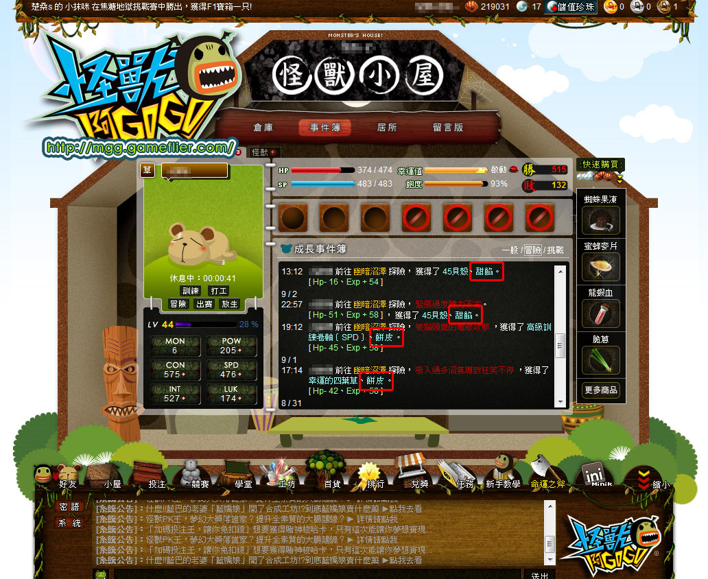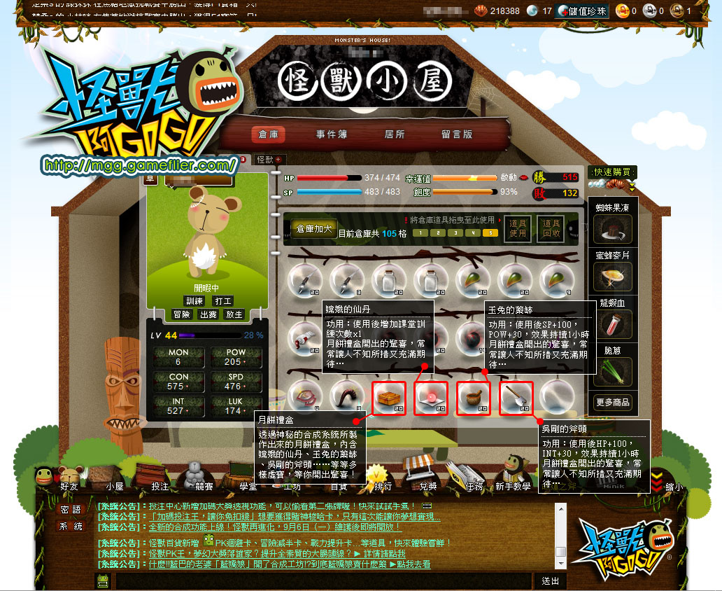 遊戲新幹線自製網頁遊戲,即日起至 10 月 4 日止,玩家在怪獸小屋裡選擇任意地圖進行冒險,就有機會在途中撿到『甜餡』和『餅皮』,至【工坊】將材料包裝成「月餅禮盒」,即可隨機獲得「嫦娥的仙丹」、「玉兔的藥缽」、「吳剛的斧頭」等活動獎勵。