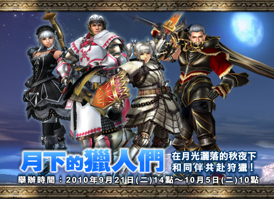 魔物獵人 Frontior Online》,即日起至 10 月 5 日止,只要是 HR 等級達到 11、17、31 以上的獵人,就可以在「自由區-梅傑波爾多廣場」的期間限定任務櫃檯內的「新領域任務」承接到「月照鬥技場」、「月光的沙漠」和「月滿森丘」等精心為中秋佳節打造的相關任務,順利完成任務的獵人將會獲得期間限定的道具與虛寶(在活動期間中,以上3個任務並非持續發送。但每天必定會有 1 個任務隨機發送,敬請於遊戲中確認目前發送之任務。)