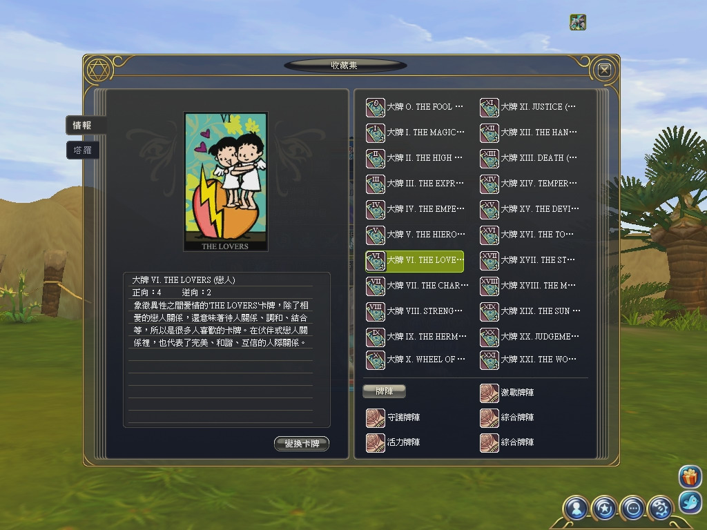 遊戲中收錄的塔羅牌總共有 78 張,其中又分為 22 張大阿爾卡納主牌(Major Arcana)與 56 張小阿爾卡納副牌(Minor Arcana)。大阿爾卡納主要是用於占卜以及副本的題材,小阿爾卡納則是用於角色素質培養、技能強化、附加能力、角色變身(怪物)等。
