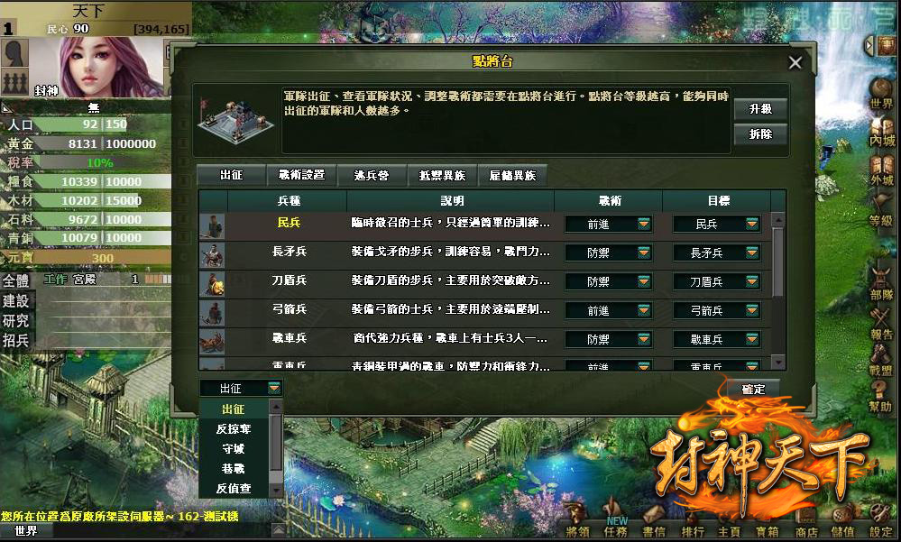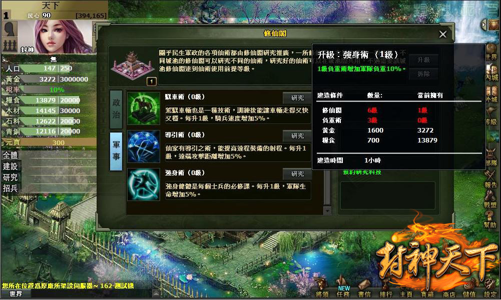 封神天下》中共有二十種不同的仙術,比如可以增加糧食豐收的「壟耕法」,增加軍隊負載量以獲得更多戰果的「風掠術」等等。隨著仙術等級越高,效果和威力都會提升,而同時,這些仙術也是發展出高級建築和兵種的前提保證,有了仙術的幫助,玩家將可更快速的拓展勢力。