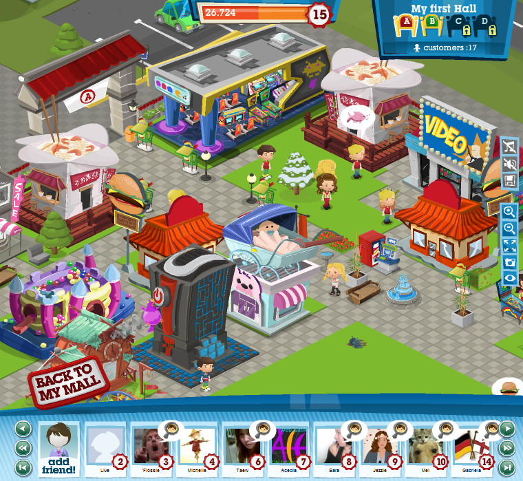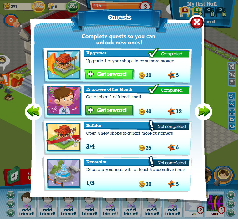前期可依照任務增設建築或是景觀為近程目標,獲得的獎勵可作為持續建設的基金。遊戲中可建造三十餘種不同店鋪,除了依任務和自己規劃的腳步進行增設外,顧客也會提出新店面的需求,完成要求除了可以增加收入還能獲得聲望獎勵。在巡視購物中心時,你隨時會看到顧客東張西望找不到商店,將顧客拖曳進商店或是點擊顧客選擇幫助都可以獲得些許經驗。營業所得模式類似