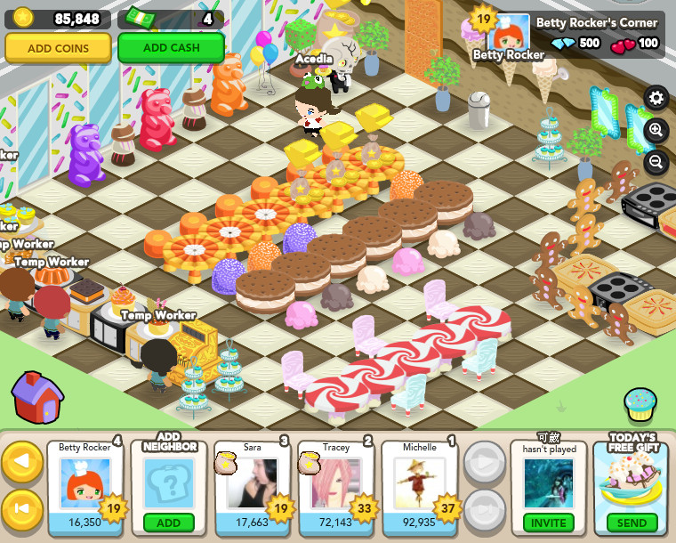 這類型遊戲另一個重點就是店內的裝飾擺設,除了烹飪的爐子有等級限制外,其餘的擺設只要有錢就可以購買,不過收銀台唯一限制是同時間只能有單台擺設,想更換較美觀的收銀台時,必須先將舊的收回才可以進行動作。若是想為自己的形象角色做各式搭配,可以在試衣間中變裝。社交互動則是透過每天拜訪來獲得獎金的鼓勵,還可以互贈糕點用來販售,阻止因產品製作不及而造成的顧客滿意度下滑。