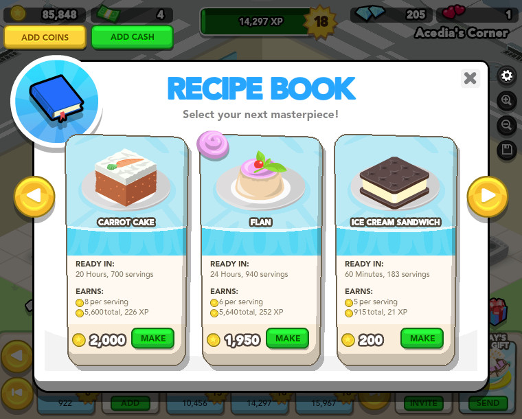 遊戲中的收入來自於販售各式各樣的蛋糕,玩家必須先經過製作手續才有成品可以販售,在製作的同時,必須先設定蛋糕外貌,選擇喜歡的顏色作局部配色用,當選定後即可進行製作,成品將會依選好的配色呈現,讓玩家更有參與感,不再是制式選擇。販售模式採同類型糕點累加展示,完成的糕點會自動上架到櫥窗上讓客戶購買食用,不會因出爐先後佔據過多的櫥窗,但如果都是做同樣的糕點,美觀上會比較不足,可同時製作時間差不多、但是外觀不同的成品來販賣。