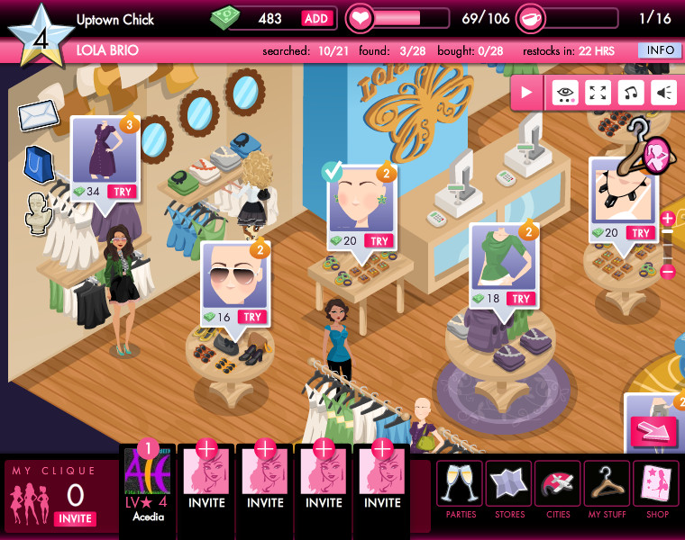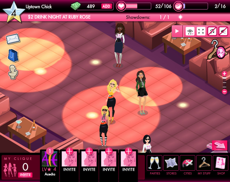 遊戲設定了近二十種的派對,主要有普通、優雅、沙灘、戶外、夜生活、上流階層的休閒派對,更加提升遊戲進行的難易度。服飾店和派對都會按等級依序開放,解鎖後才可以自由參加,若是解鎖但未達高標等級,還是必須支付些許的門票錢。