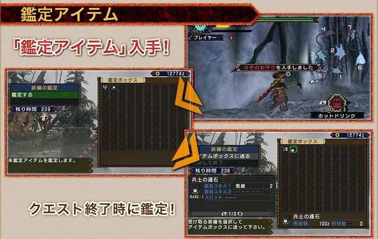 任務中得到的「神秘鑄塊(なぞの塊 )」、「神秘護身符(なぞのお守り)」等等,在任務結束時會自動鑑定,也有只有鑑定才能得到的稀有武器或護身符。