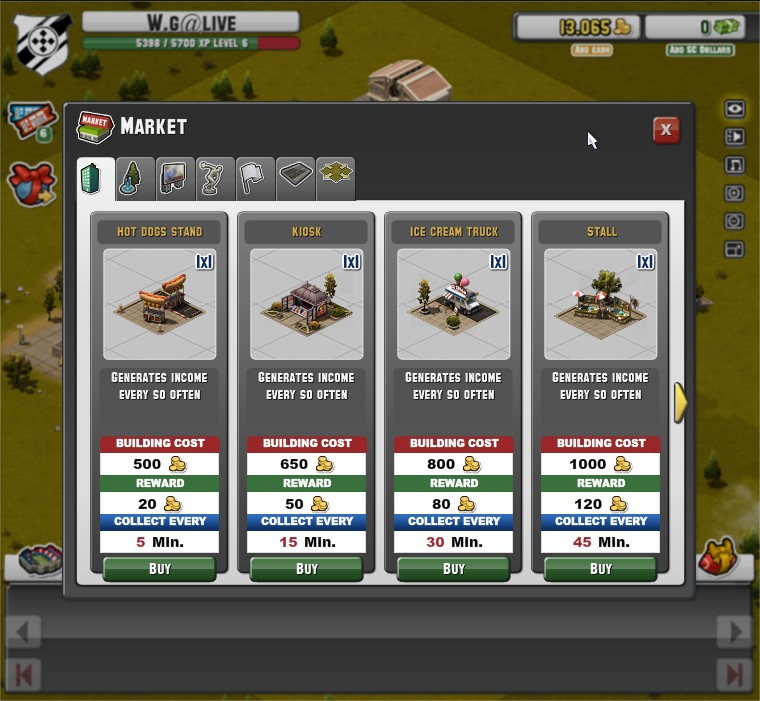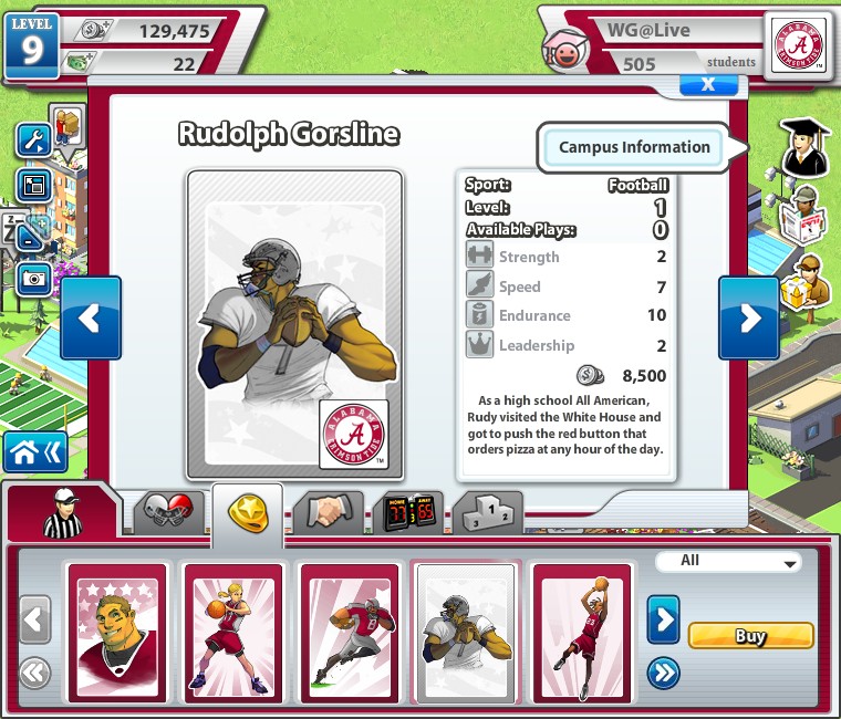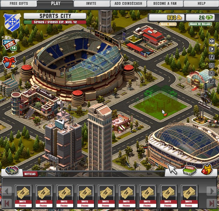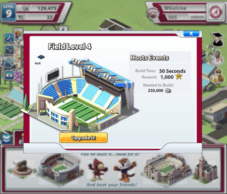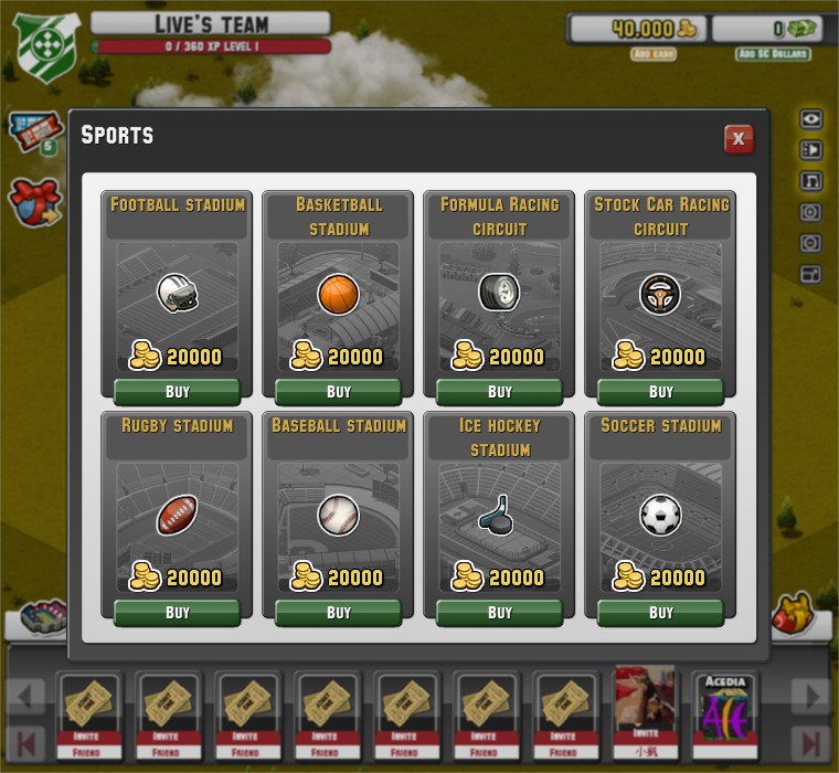 Social City》的朋友對此遊戲的進行方式應該不陌生,金錢收入可於固定時間從商業建築領取,或是點選運動場舉辦各類大型活動及比賽獲得;但運動場數量會依玩家等級受到限制,場內可舉辦的活動必須靠升級運動場規模等級才可解鎖。經驗值方面可由新增建築、舉辦比賽活動獲得;另一個取得方式為校際比賽,可透過與其他玩家間較勁獲得經驗,目前有兩種比賽可供選擇,
