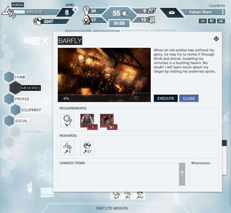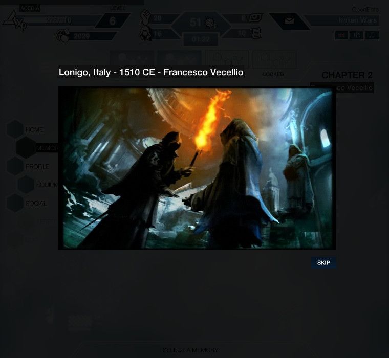 刺客教條》的過場動畫。遊戲進行當下的一些物品需求,可透過購買或是前置關卡中獲得,部份較特殊的物品是一次性的,用完就必須購買或是再想辦法獲得,如果遇到無法從商店直購的物品,只要點選該物品,系統會貼心的直接送玩家到前置關卡,重複闖關到物品足夠後再自行離開。
