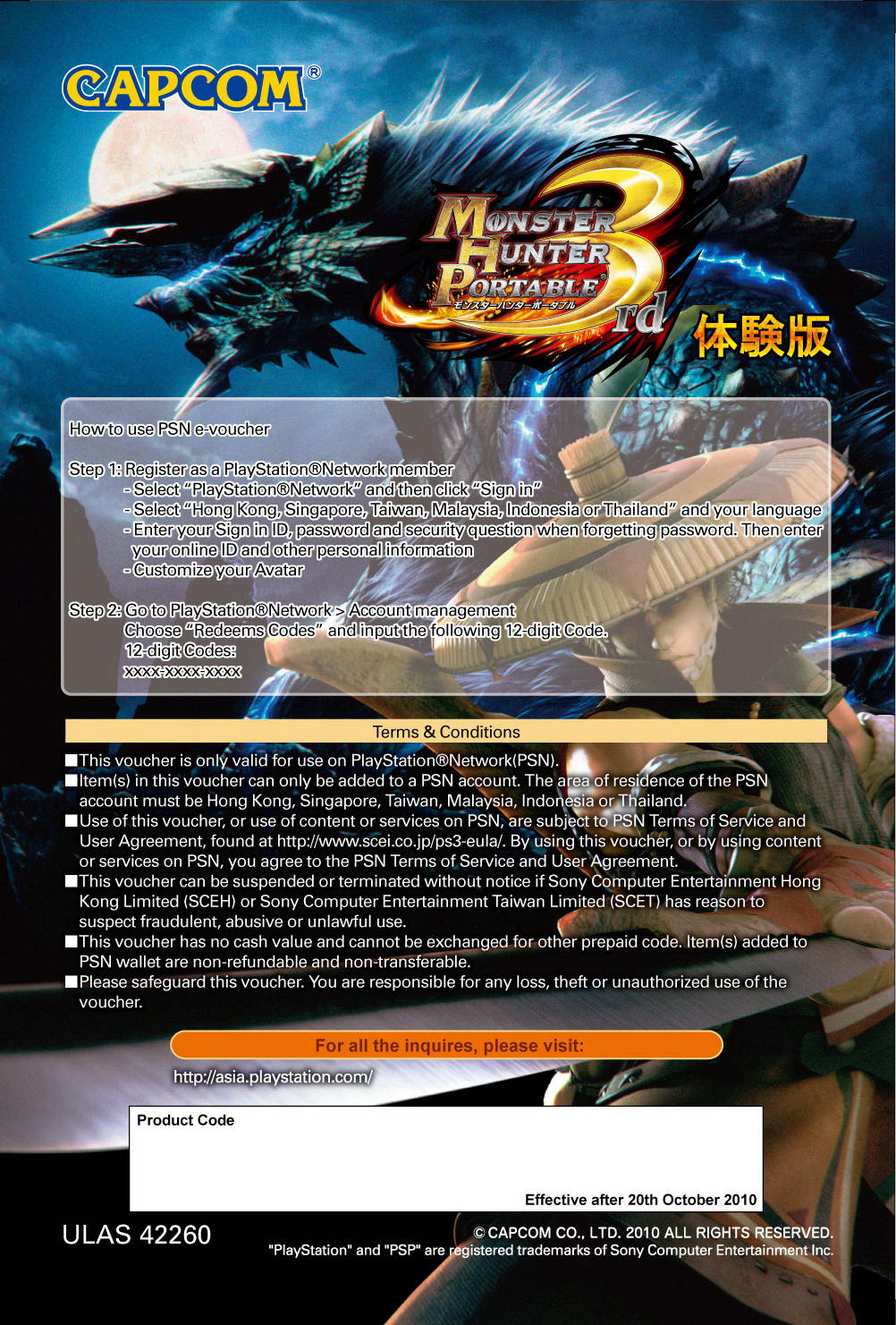 (3)請記得將中文說明書以及回郵信封,連同玩家的姓名、聯絡電話以及電子郵件信箱寄至美商藝電有限公司台灣分公司,地址如下:台北市敦化南路二段 335 號 2 樓 b5 室,信封面請註明「申請魔物獵人 3 試玩版」,收到試玩版的玩家們將可以連線到 PSN 下載《