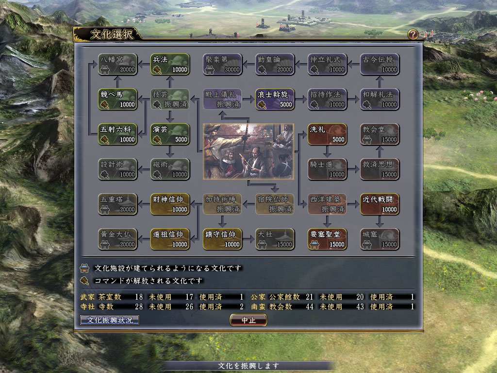 「文化」是用來強化勢力的新要素,分為「武家」、「公家」、「寺社」、「南蠻」4 個體系。玩家只要充分振興文化,就能建設對作戰有利的強力新設施,或是利用朝廷的權威展開新的外交手段等,獲得對應各體系特性的各種效果,提供更廣闊的戰略手段。