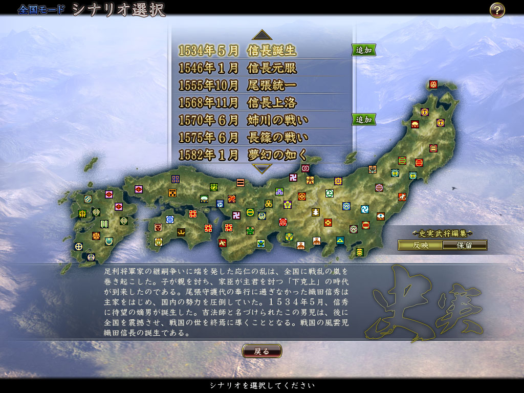 追加收錄超過 100 名武將以及相應的歷史事件,像是描寫德川家康祖父松平清康遇刺事件的「守山崩塌」、描寫今川家家亂的「花倉之亂」與描寫齋藤道三生涯的「蝮蛇的竊國」等,在信長誕生前的時代所發生的眾多歷史事件,替戰國時代添增更多色彩。
