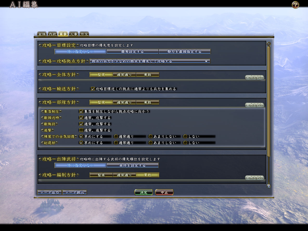 「AI 編輯」是可以自訂諸侯勢力 AI 思考模式的編輯功能,分為「全體」、「內政」、「軍事」、「人事」、「外交」5 個項目。只要透過簡單的設定,就可以改變特定諸侯勢力的思考與行動模式,製作出各式各樣獨具特色的 AI,像是擅長火槍集團作戰的鈴木家專用 AI、擁有最強騎兵軍團以上京(上洛)為目標的武田家專用 AI 等。