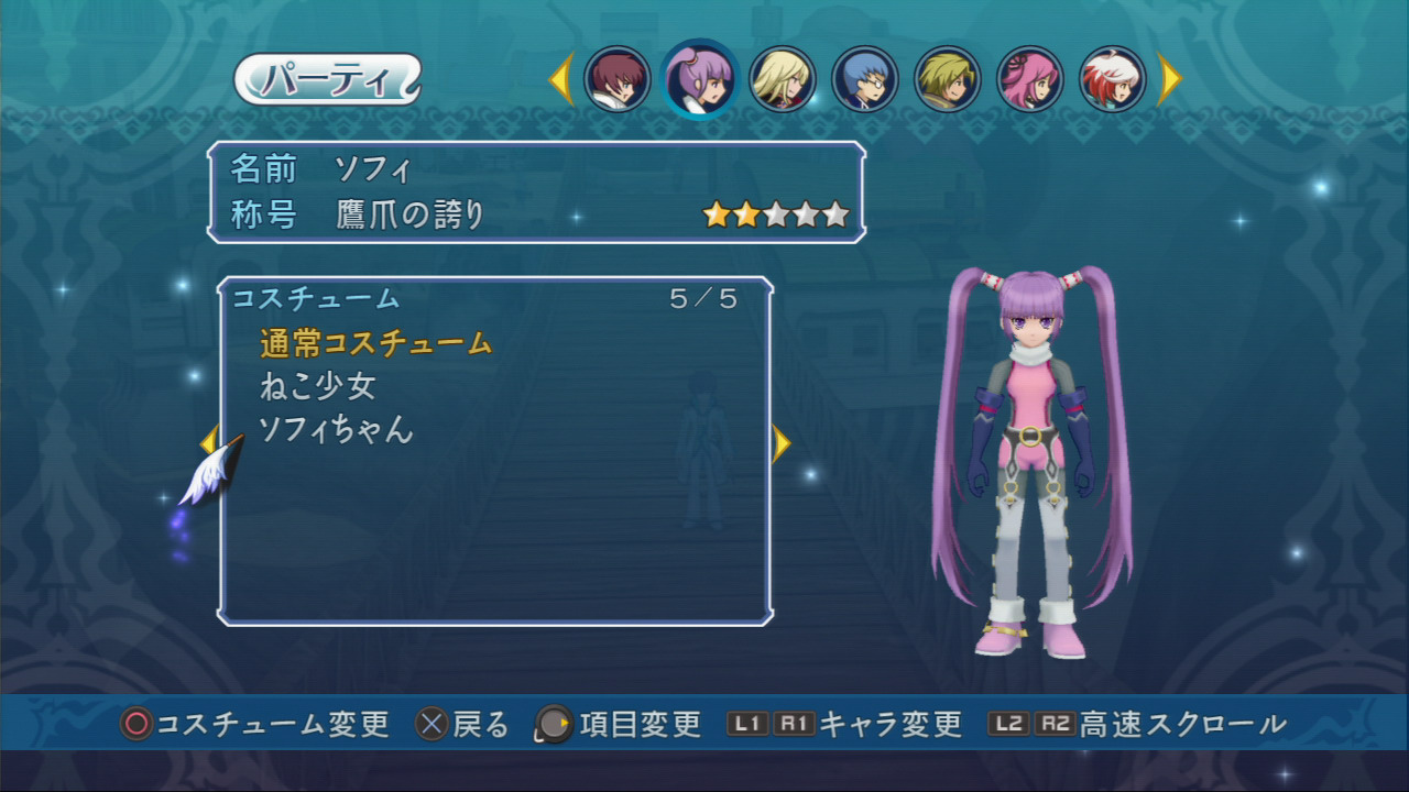 遊戲中各角色可以獲得各式各樣的「稱號」,其中有部分稱號除了可以學習到特定技能之外,還具備改變角色服裝造型的功能,可以在隊伍選單中自由更換。除了更換服裝之外,還可以替角色配戴各式各樣的配件,讓事件場面或戰鬥場面的氣氛為之一變。