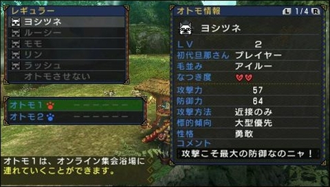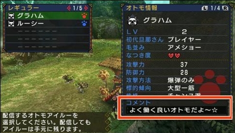 可以使用通信機能,和其他獵人交流培育的艾路。在 PSP 的睡眠模式中也可以自動進行隨行發布,自己的獵人卡片也可以一起發布。重點是「就算發布隨行艾路還是會留在自己身邊」所以請毫無顧慮的和其他獵人們交流吧。