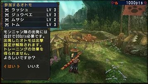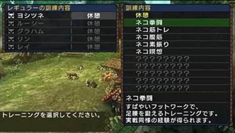 還可以用「優克摩點數(ユクモポイント)」來交換更強力的訓練設施,提昇艾路們的訓練效率。利用「貓劈柴(ネコ薪割り)」大幅提昇攻擊力、「貓擋樹(ネコ丸太受け)」大幅提升防禦力。一個設施一次只能給一隻艾路使用。