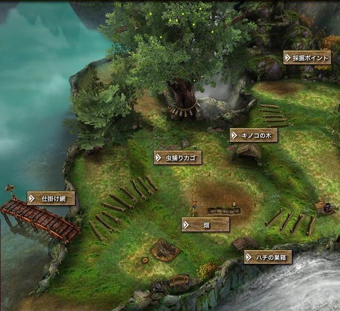 ‧蘑菇木:栽培磨菇(キノコ)用的木頭,可以在上面採集自然生長的蘑菇。隨著設施的擴張,可以採集的蘑菇數量和種類也會增加。