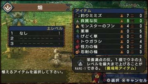 ‧田地:種下種子或草類道具之後等待收成,使用肥料使「土壤等級(土レベル)」上昇收穫量也提昇。