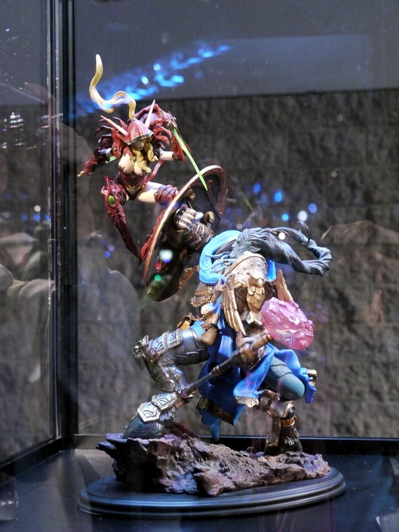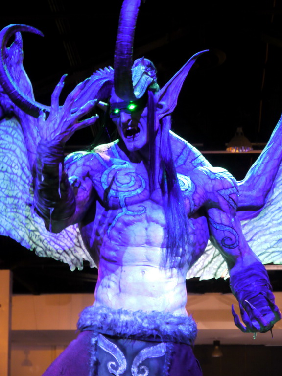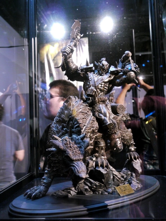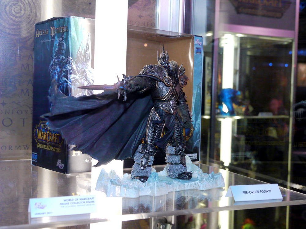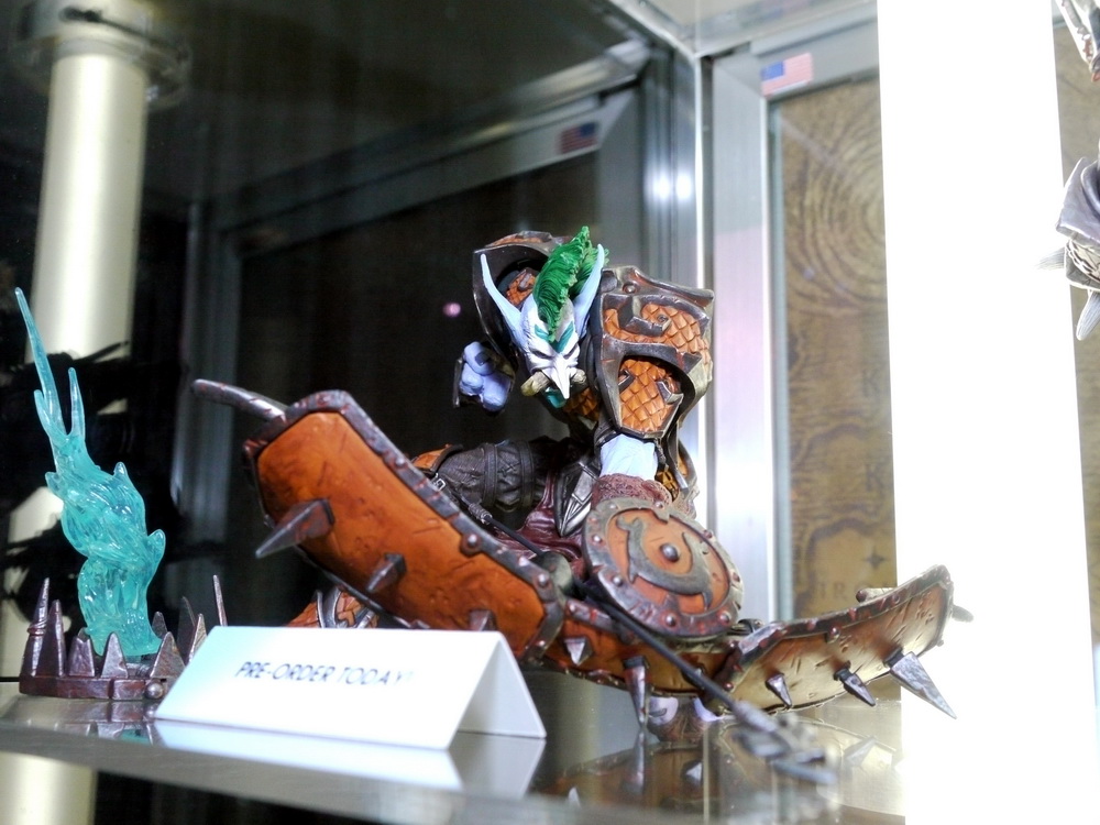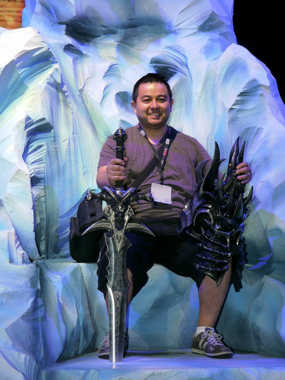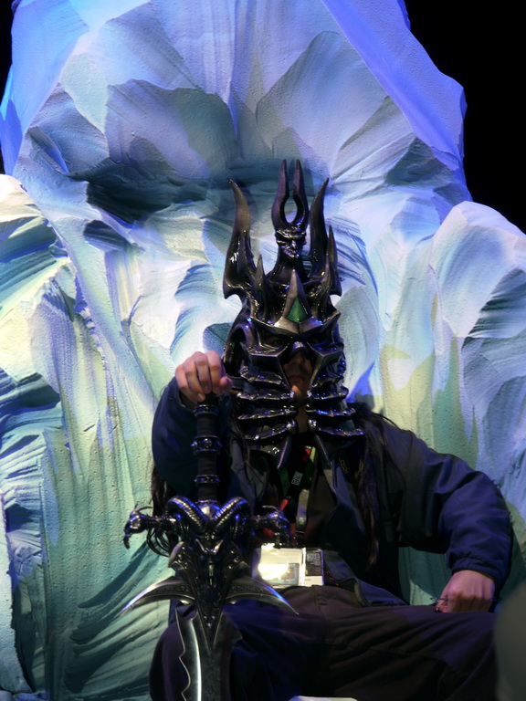 在龐大的試玩機台旁,有著巨型的伊利丹雕像,另一側則是巫妖王的冰封王座;在《