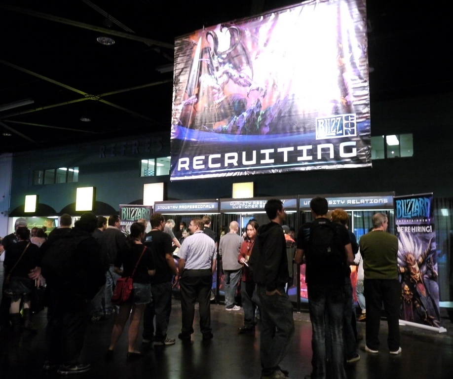 附近的 Blizzard 招募人才的攤位今年比往年更擴大規模,相較於以往集中一個窗口讓玩家詢問,今年細分為產業專業人才、客戶服務與品管、大學關係等三大類,讓玩家可以按照個人所長或興趣,來排隊探詢工作機會,而每個窗口都有玩家耐心排隊,希望爭取進入 Blizzard 的機會。