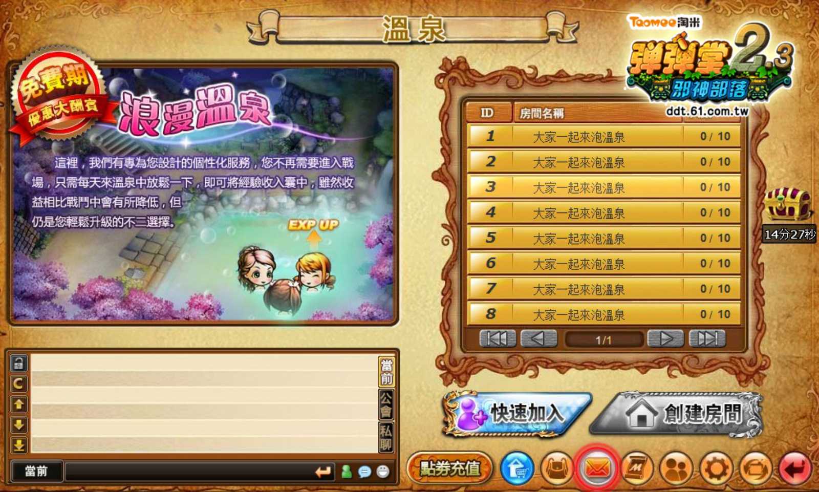 針對長期經歷槍淋彈雨洗禮的玩家,在新的遊戲資料片中,也規畫了輕鬆提升經驗值加成的「溫泉系統」,即日起至 11 月 30 日止,玩家還可免費進入到溫泉房間邊泡溫泉邊獲得經驗值加成,每個房間最多可容納 10 人,玩家每天最多在溫泉房間可以待 1 個小時,中途退出可以再次進入直到時間消耗完畢。