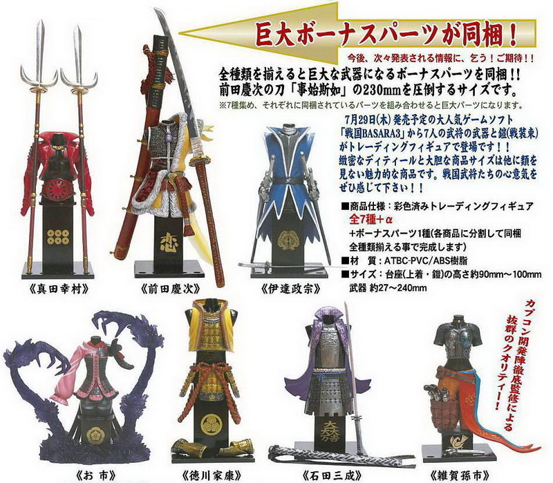 「戦国BASARA3 武器・鎧コレクション」 發售日期:11 月中旬 製作單位:カプコン 定 價:6552 元(日幣) 備 註:8 個一組 |
