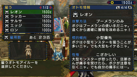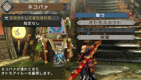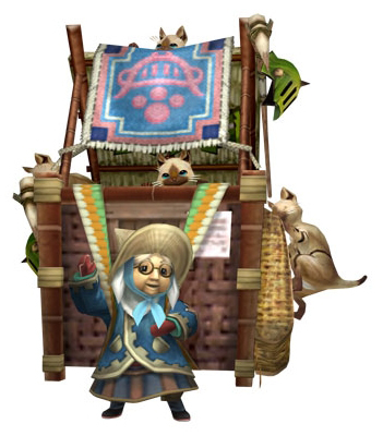 幫獵人仲介隨行艾路的貓婆婆,隨行艾路最多雇用 25 匹,想解雇的時候請向貓婆婆、或是利用隨行公布欄。