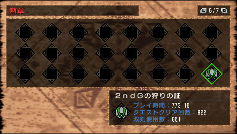 ● 勳章「2nd G 狩獵之証」以及在 2nd G 的遊戲時數、通過任務數和武器使用次數的紀錄。