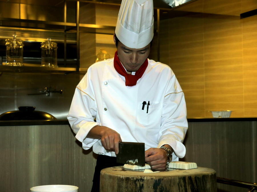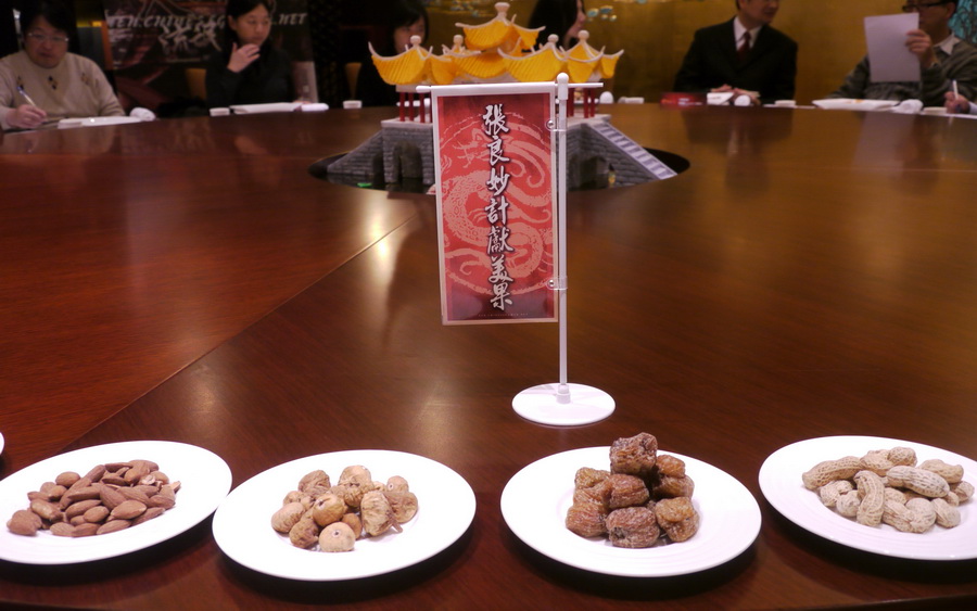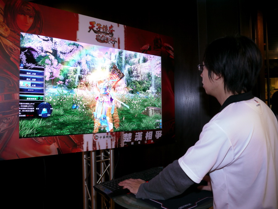 中華網龍今日在記者會現場,以劉邦、項羽的楚漢相爭為故事題材,設計了呼應故事主題的經典揚州菜色,並由師傅展示將豆腐切成細絲的精湛刀法。