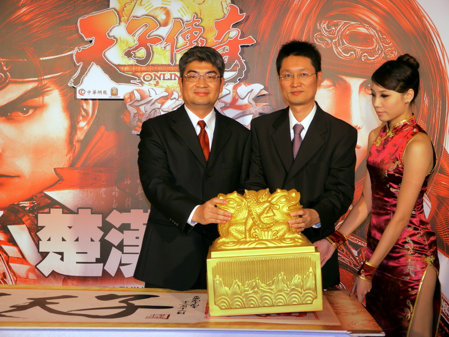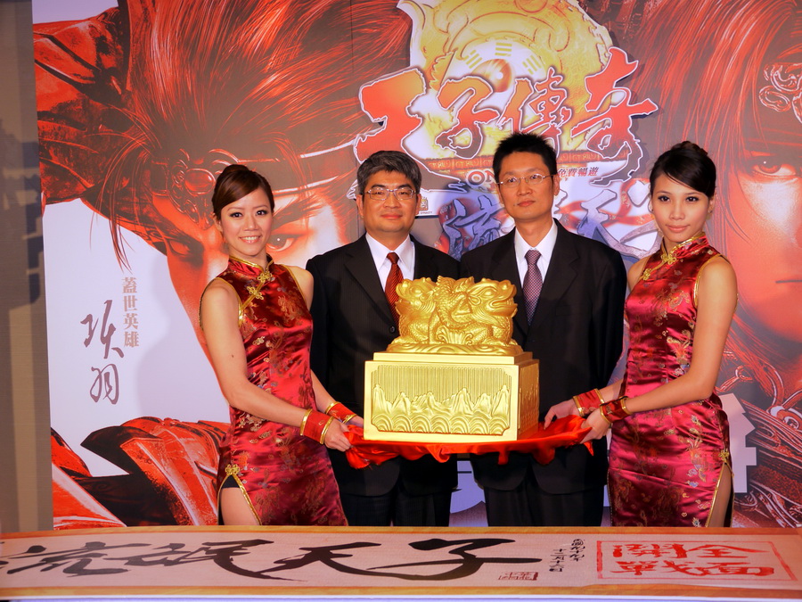 中華網龍總經理呂學森與副總經理劉裕敏在記者會上,攜手在寫有「流氓天子」書法卷軸上,合力蓋上玉璽,象徵首部資料片《流氓天子》全面開戰。呂學森表示,《