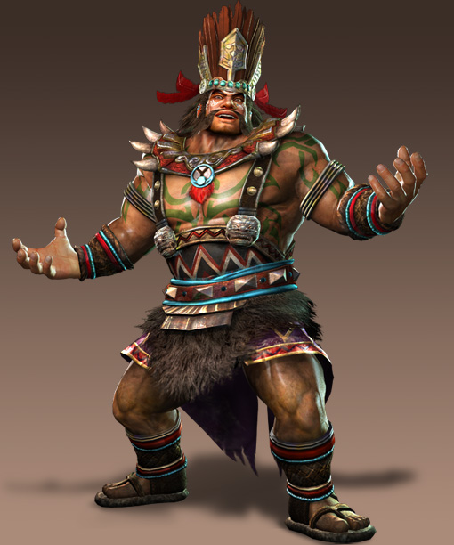 孟獲是南中之王,有著超乎常人的巨大身軀與強大力量,不只是王者同時還是最強的戰士。行動時感情優先於思考。除此之外,還是個與外表毫不相稱的愛妻者與懼妻者。