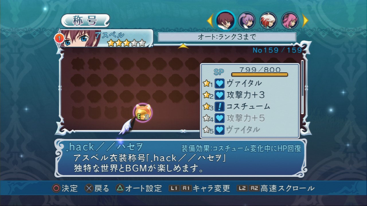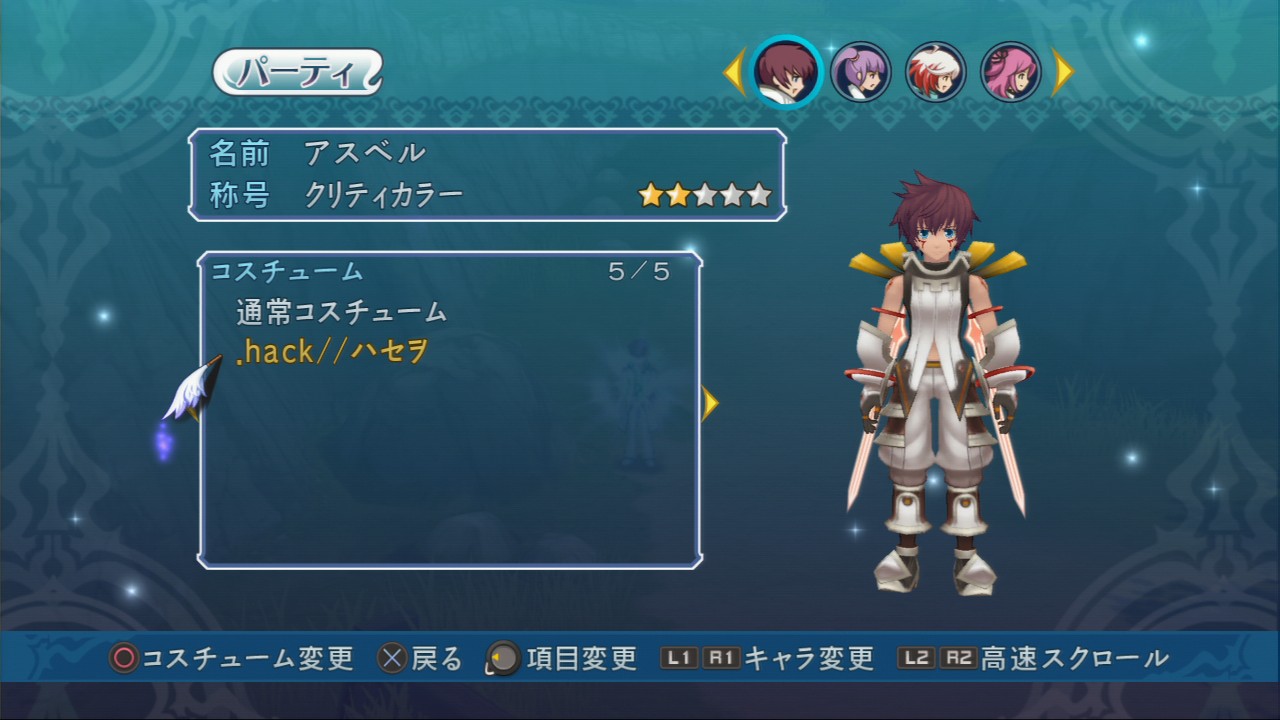 創世紀傳說(.hack//)》登場角色長谷雄(ハセヲ)造型所設計的艾斯貝爾用服裝稱號,穿著後升級時可獲得技能,戰鬥音樂也會跟著改變。