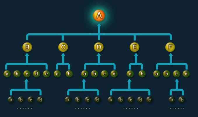 | A為B的上級,B~F為同階級的團員,a~e為下級成員 |