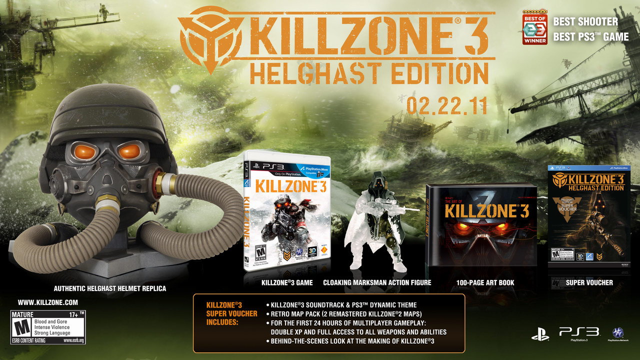 殺戮地帶 3》已完成開發工作並進入壓片階段,並公布了遊戲封面以及同步推出的豪華典藏版「赫爾蓋斯特版(Helghast Edition)」內容,將收錄仿真赫爾蓋斯特頭盔複製品、隱形狙擊兵可動人偶模型、100 頁美術畫冊與特典內容下載卡。