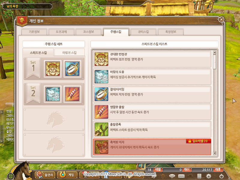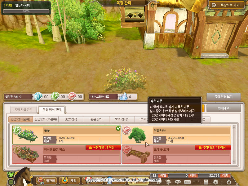 進入遊戲後即會得到馬場主人贈送的馬,還有一座屬於自己的馬場,每位玩家獲得的馬外觀皆相同,但是可以自行幫馬兒取個好聽的名字。初期馬場沒有特殊用途,主要是讓玩家在這裡練習基本的遊戲操作,當角色到達 12 等級後,系統會自動釋出馬場建設選項,隨著越來越多的建設,馬場等級也會提升,當其他玩家來自己的馬場逛逛就更有成就感。