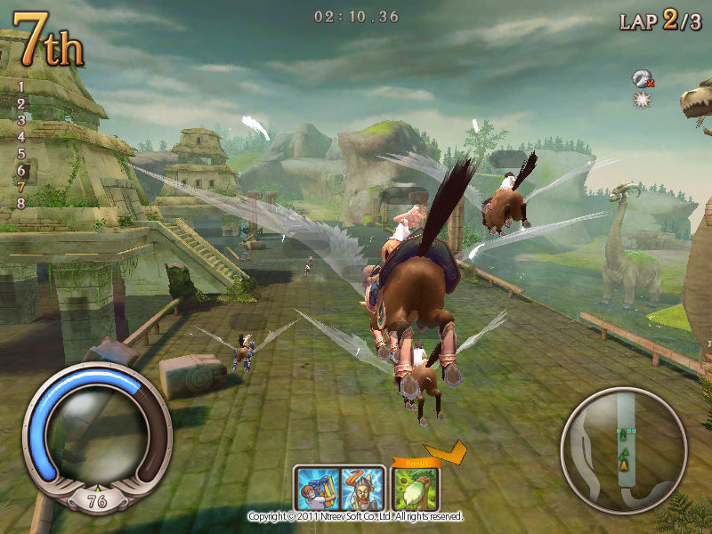 針對技巧卓越的玩家來說,系統也給予加速的獎勵,只要順利越過障礙物或甩尾就可以增加一點馬力能量,累積到 3 分之 1 即可看到左下角獲得一個馬蹄形的加速器,施放後即可短時間加速。