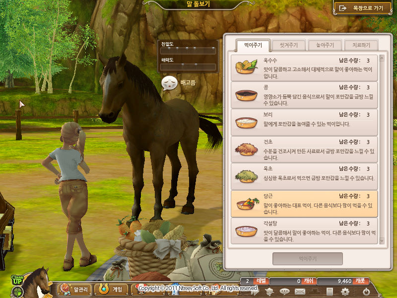 透過參與更多比賽累積經驗後,角色等級到達 2 就可以與馬兒有更多互動。互動方法分成 4 大類,除了餵食、清潔外,還能一同遊戲及治療馬兒,這些都是透過簡單小遊戲完成。越多的互動可以增加親密度與魅力值,提升日後參賽獲得額外獎勵的機率。
