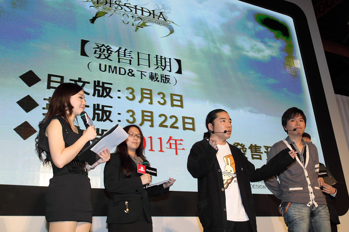 Dissidia 012 Final Fantasy》製作人間一郎與總監高橋光則登台示範對戰,並確認將於今年春季在台推出繁體中文版以及特別款式 PSP 主機同梱包裝,還會提供中文版特有的同梱 / 預約特典。活動後並接受巴哈姆特 GNN 等媒體的聯訪,內容將於後續刊出。