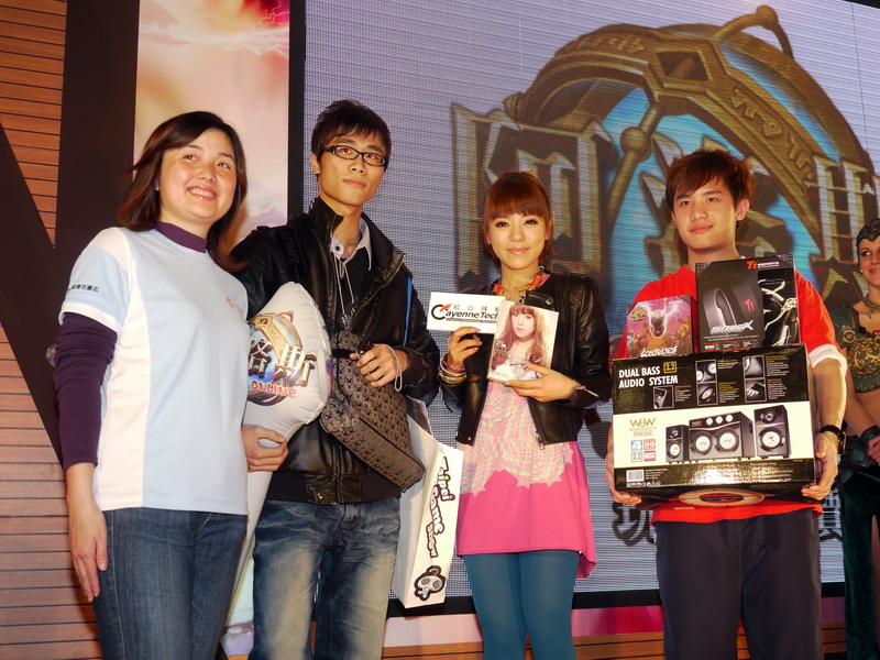 》遊戲限量虛寶-座騎「熾熱獅」及喇叭、曜越科技贊助的黑翼鯊光學電競滑鼠、電競專業耳機等,來進行愛心競標,吸引不少玩家紛紛競標喊價,最後現場由胡文傑、劉俊偉兩位愛心玩家,分別以 3500 元及 3700 元得標,兩名玩家除標得上述品項外,也與丁噹一同合照。