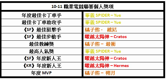 此次職業電競聯賽頒獎典禮共頒發 9 大個人獎項,包括依據戰績數據推算的最佳卡丁車手、最佳卡丁車助攻手,《SF》最佳步槍手與狙擊手,還有年度最佳教練、由粉絲票選的年度人氣王,以及《SF》最佳新人王、《