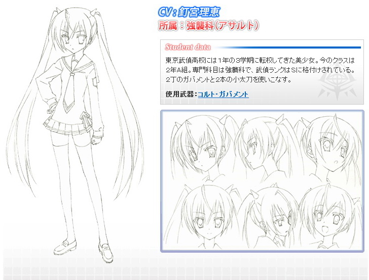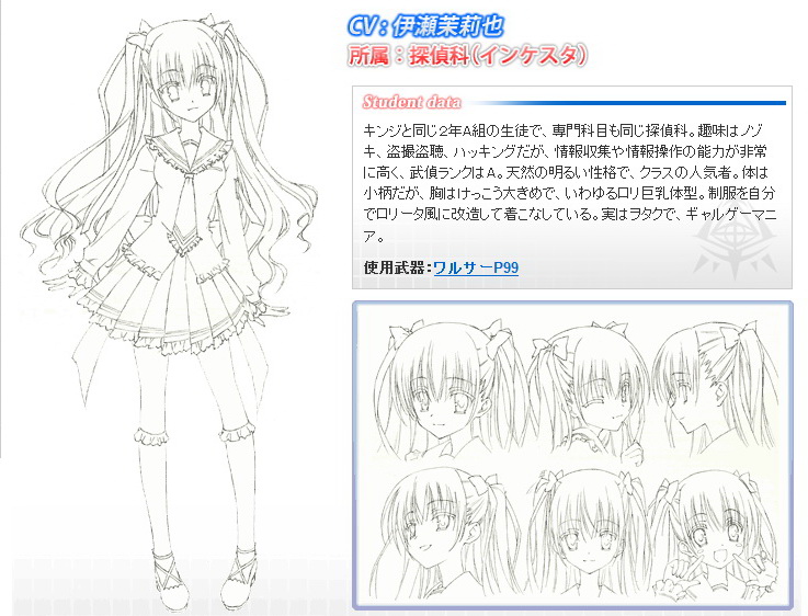 與金次同樣是 2 年 A 班偵探科的學生,興趣是偷窺、偷拍、駭客等,擁有相當厲害的收集情報及操作情報能力,等級為 A。天然且開朗的個性,在班上也相當有人氣,雖然身高不高但卻擁有大胸部,也就是所謂的童顏巨乳體型。制服是自己改造的蘿莉塔風格,實際上是個御宅族,相當喜愛美少女遊戲。