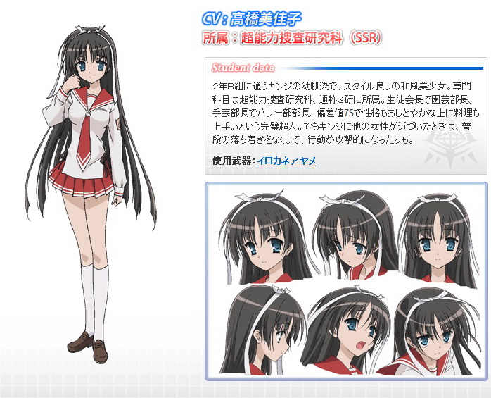 金次的青梅竹馬,就讀 2 年 B 班日本大和撫子類型的美少女,專門科目為超能力艘查研究科,通稱為 S 研。同時身兼學生會長、園藝社社長、手工藝社社長與排球社社長,學力偏差值(用來作學力測驗的數值)為 75,個性穩重、對於料理也很拿手的完美超人。但若發現金次與其他女生親近時,就會一反平時的沉穩,整個人都會充滿攻擊性。